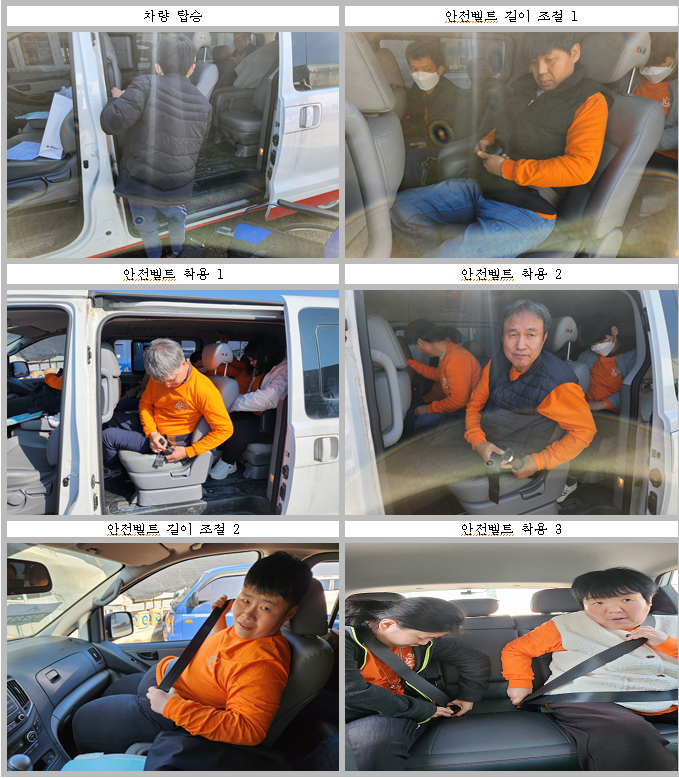 - 차량 승차 시에도 본인 체형에 맞게 안전벨트 길이를 조절하는 실습 형태의 훈련을 통해 참여 이용인이 통근훈련교육에 대한 이해도가 높아지는 활동을 진행함.
