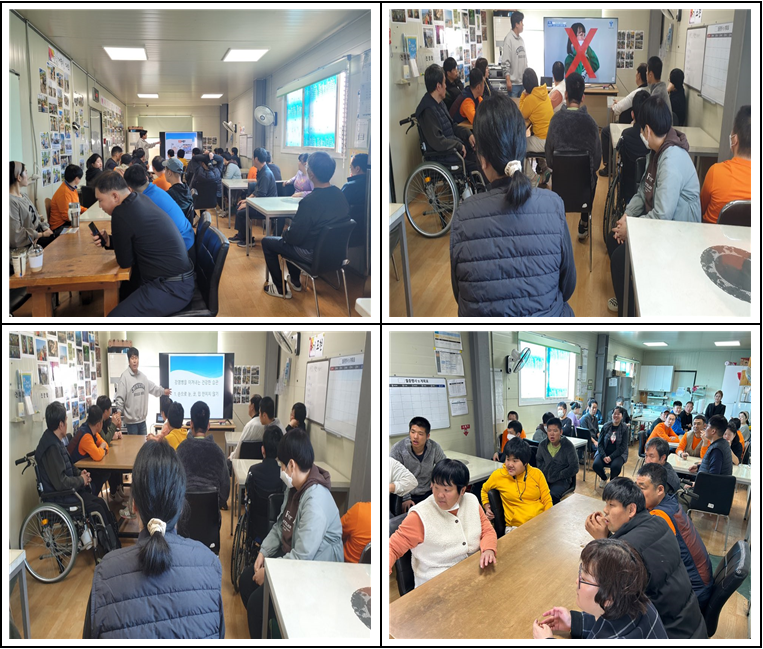 일상생활훈련 - 개인위생관리교육 장재호 0 710 2023.11.21 08:40 일상생활훈련 - 개인위생관리교육일 시 : 2023년 11월 2일 13:00~14:00 장 소 : 세종장애인보호작업장 활동실11월 2일(목)에는 이용인분들을 모시고 개인위생관리교육 프로그램을 진행하였습니다.교육 주제로는 '건강한 생활습관 만들기 및 감염병 위험성을 알고 감염병 예방수칙 실천하기' 라는 내용으로 진행하였습니다.앞으로도 이용인들에게 필요한 내용들을 파악하여 프로그램을 통해 진행하고자 노력하겠습니다.감사합니다.