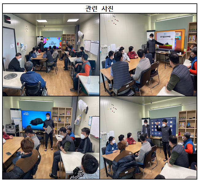 대인관계기술향상훈련-인지능력향상(11.18) 연정민 0 1110 2022.11.18 19:02 2022년 11월 18일 금요일오늘은 대인관계기술향상훈련을 위한 인지능력향상 프로그램을 진행하였습니다.프로그램의 주제는 "나는 누구일까요?" 이며 화면에 나오는 힌트들을 유추하여 정답을 맞추는 게임 형식으로 진행하였습니다.계획 당시 문제가 너무 어려우면 어쩌지라는 고민도 잠시 팀간 소통을 통해 빠르게 정답을 맞추는 모습에 오히려 당황스러웠습니다.이용인들과 함께 1시간을 꾹꾹 눌러 담아 보낸 즐거운 시간이었습니다.