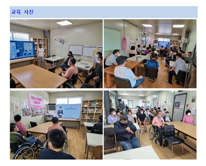 자기옹호훈련 및 자기주장훈련[직장 내 괴롭힘 예방교육] eun 0 1062 2022.06.28 21:01 [직장 내 괴롭힘 예방교육]일 자 : 22.06.22.세종장애인보호작업장에서는 직장 내 괴롭힘 예방교육을 진행하였습니다.직장 내에서 발생할 수 있는 괴롭힘에 대해 배울 수 있는 시간이 되었습니다.직장이 있는 곳이라면 어디에서든지 발생할 수 있는 사항으로 직장 내 괴롭힘은 모든 종사자 및 사용자가 근절해야 할 문제로 인식할 필요가 있다고 생각 합니다.