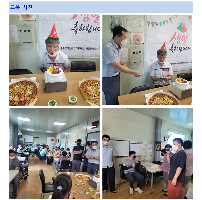 대인관계능력향상훈련-6월 생일파티(6.30) eun 0 1409 2022.07.01 16:53 세종장애인보호작업장에서는 6월에 생일을 맞이한 이용인의 생일파티를 진행하였습니다.코로나 19로 인해 직접 다과를 구입하러 가거나 직접 선물을 선택하지는 못했지만, 욕구에 따라 음식을 선택하고 동료 이용인과 함께 먹으며 즐거운 시간을 가졌습니다.생일자 이용인 진심으로 생일 축하합니다~!!!