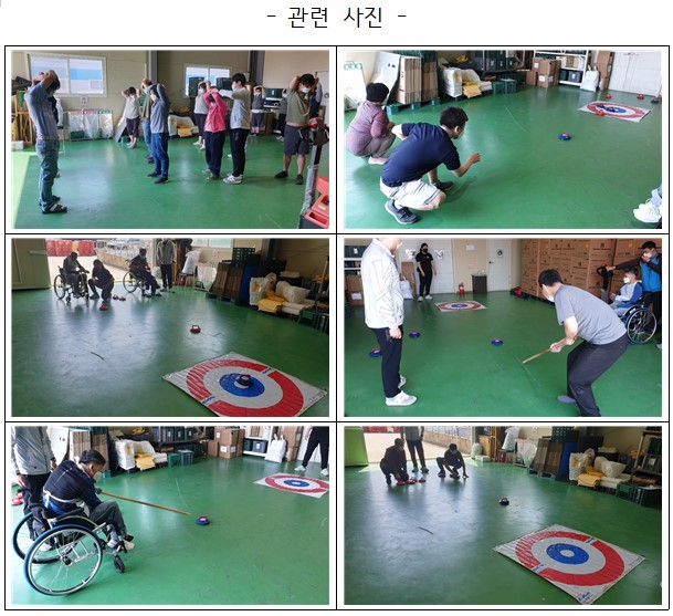 특수체육활동 - 컬링(05.24) 생산판매관리기사 0 1335 2022.05.25 20:44 금일 체육활동은 컬링이라는 구기 종목경기를 진행하였습니다!!스트레칭 및 준비운동을 마치고 강사 선생님의 설명에 따라 2명씩 나와 파란색, 빨간색 스톤을 한번씩번갈아가며 총4번 밀어 가운데 작은 동그라미에 최대한 많이 들어가는 것으로 승부를 겨루었습니다.오랜만에 진행되는 체육활동에 이용인들 모두가 즐거워하며 적극적으로 참여하였으며,집중력을 향상시키고 스포츠맨십을 익히는 시간이 되었습니다!